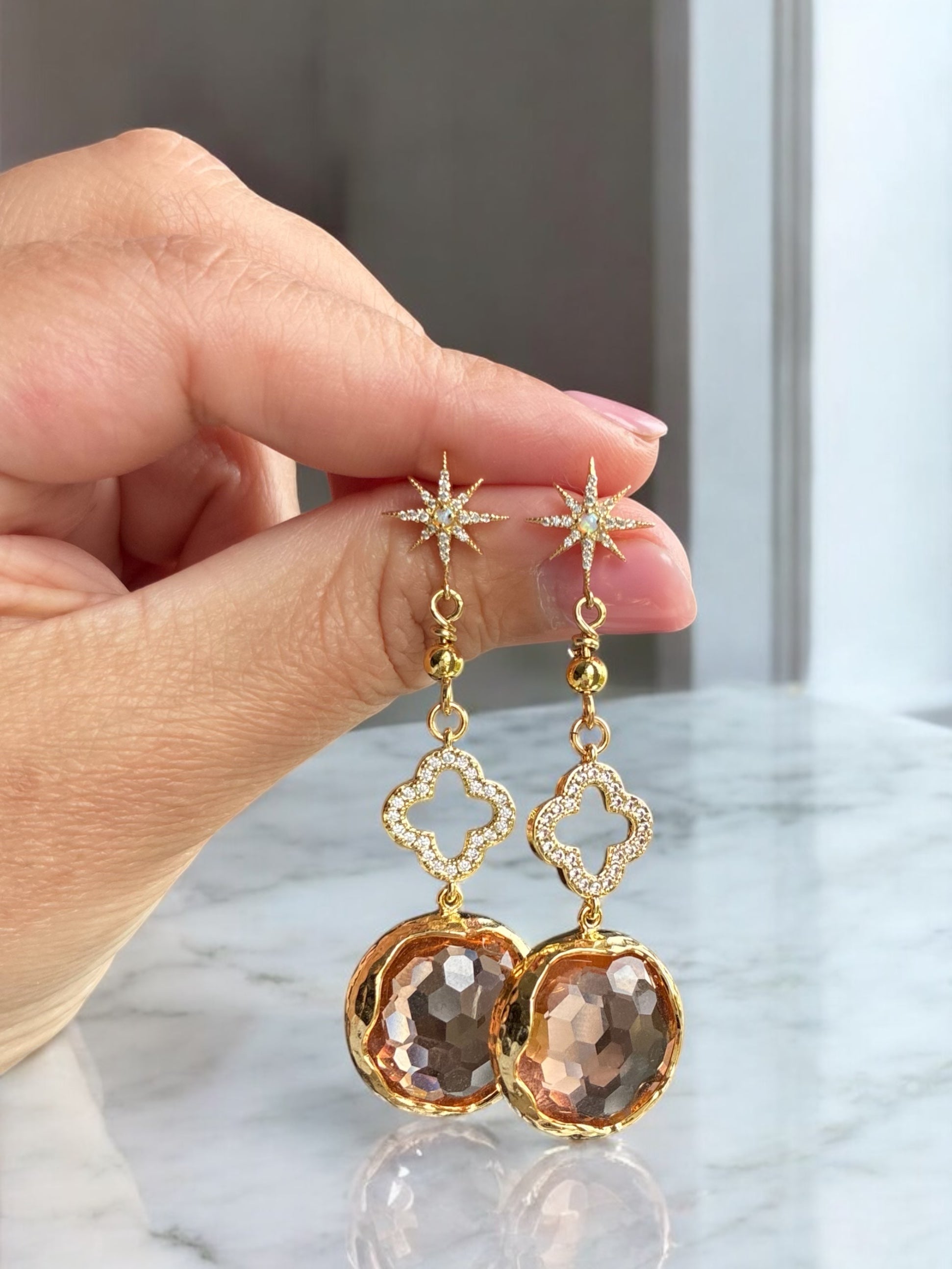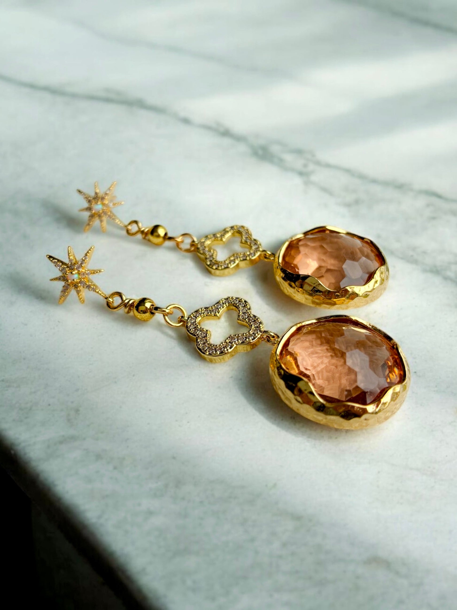 Material: Guldpläterade örhängen med peachfärgade hängen och en klöver med små cubic zirconer.
