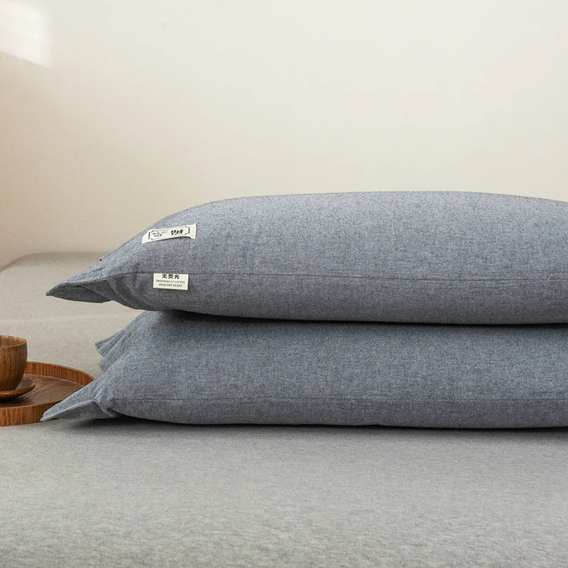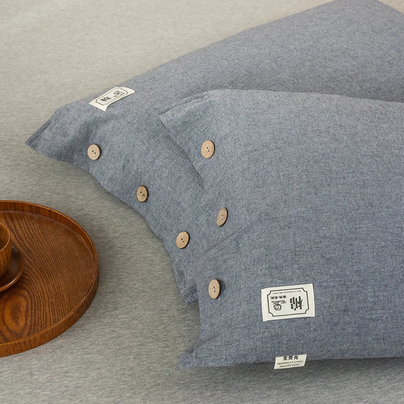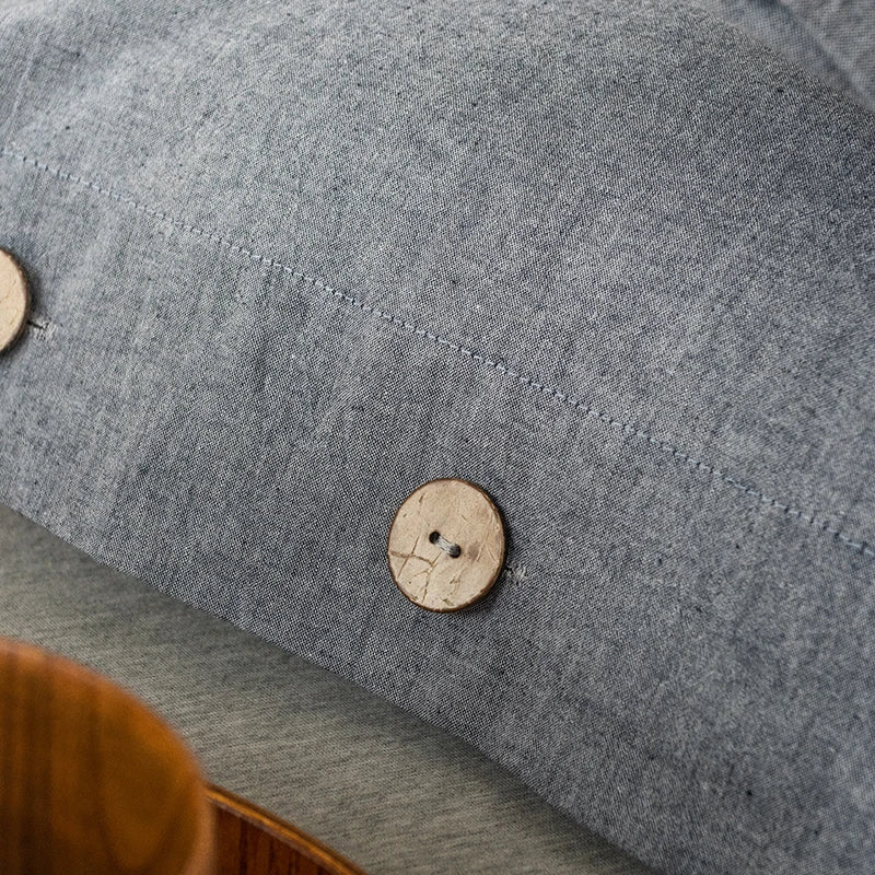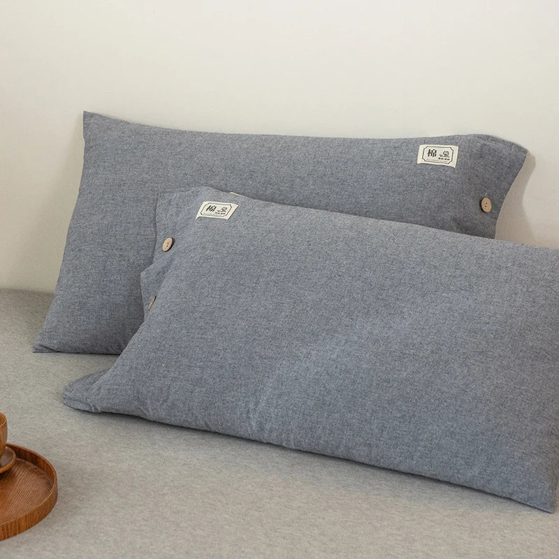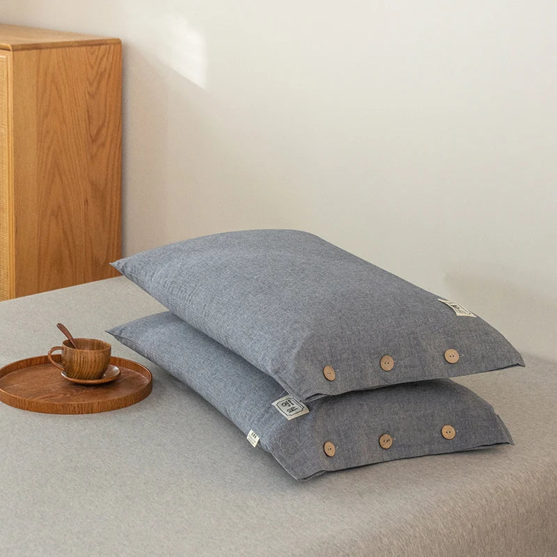 Uppgradera kuddkänslan med två lyxigt mjuka örngott i kammad bomull. Tyget (400 TC) har en chambray-liknande melangeeffekt som ger ett avslappnat, men ändå stilrent uttryck. Sidans dekorativa träknappar fungerar både som fin detalj och praktisk kuvertstängning – inga glidande kuddar, bara ren sovkomfort.