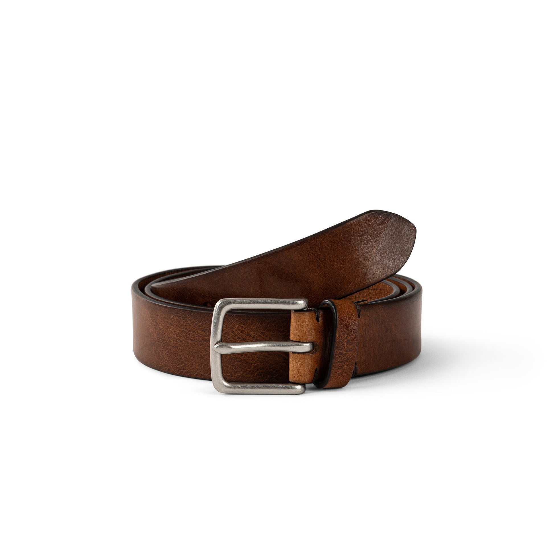 Smalt lättanvänt läderbälte med behandlade kanter och enkelt spänne i ljus silverfärgad metall med rundade hörn. Det vegetabiliska garvade, anilinfärgade narvlädret åldras naturligt med tiden, och kommer att variera i färg och ytstruktur.