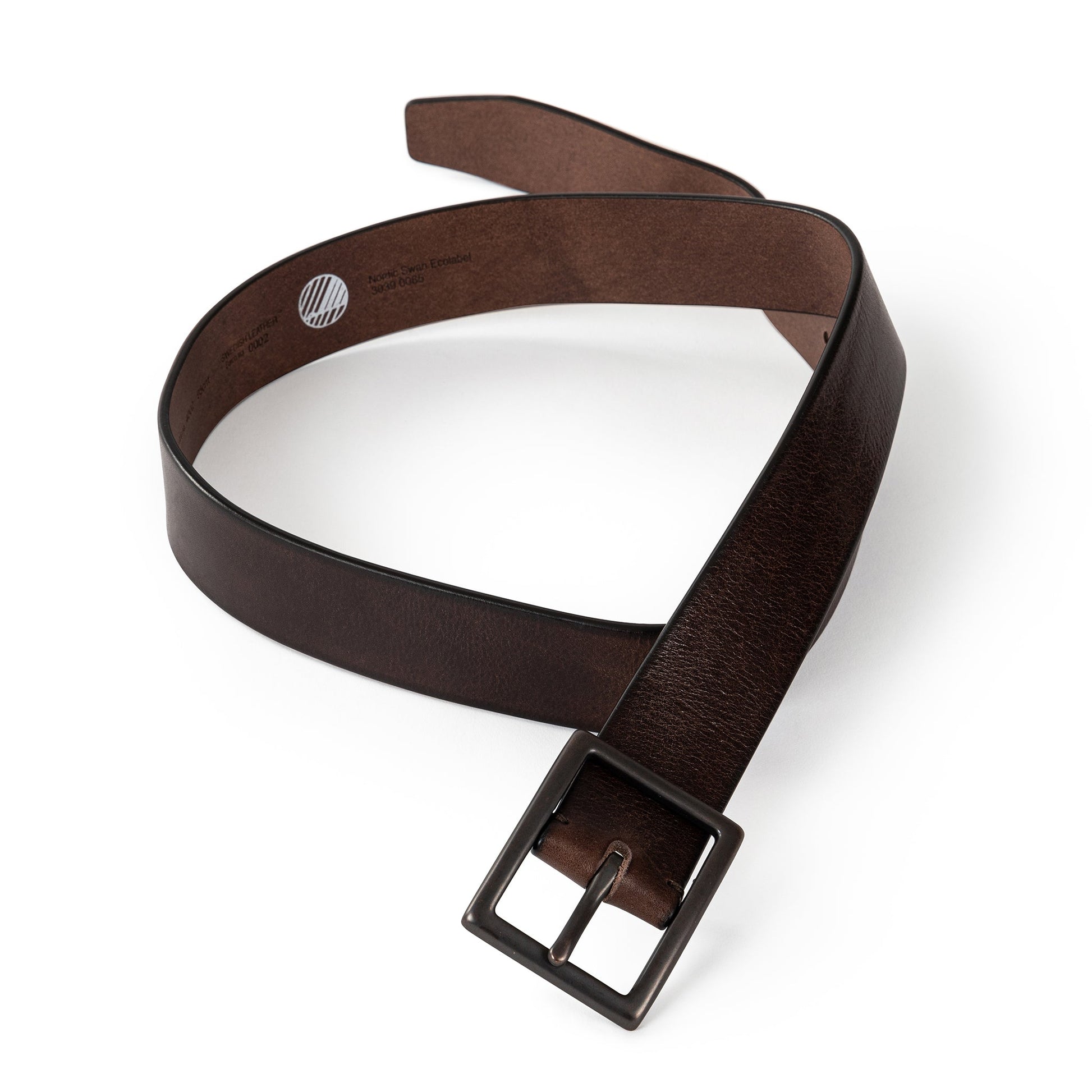 A more firm classic leather belt with structured edges and an open broad buckle in oxidized metal. The masculine feature of the colour fits well to jeans. The vegetable tanned, aniline coloured grain leather ages naturally with time, and will vary in colour and surface texture.