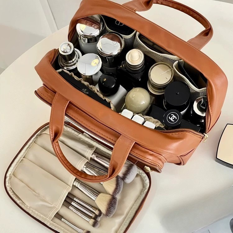 Passar för dig som vill ha ordning på smink, borstar och hudvård både hemma och på resan.Väskan har ett separat fack med borsthållare som håller penslar på plats, samt praktiska innerfack och nätficka för småsaker. Den öppnas brett så att du får snabb överblick över hela innehållet.